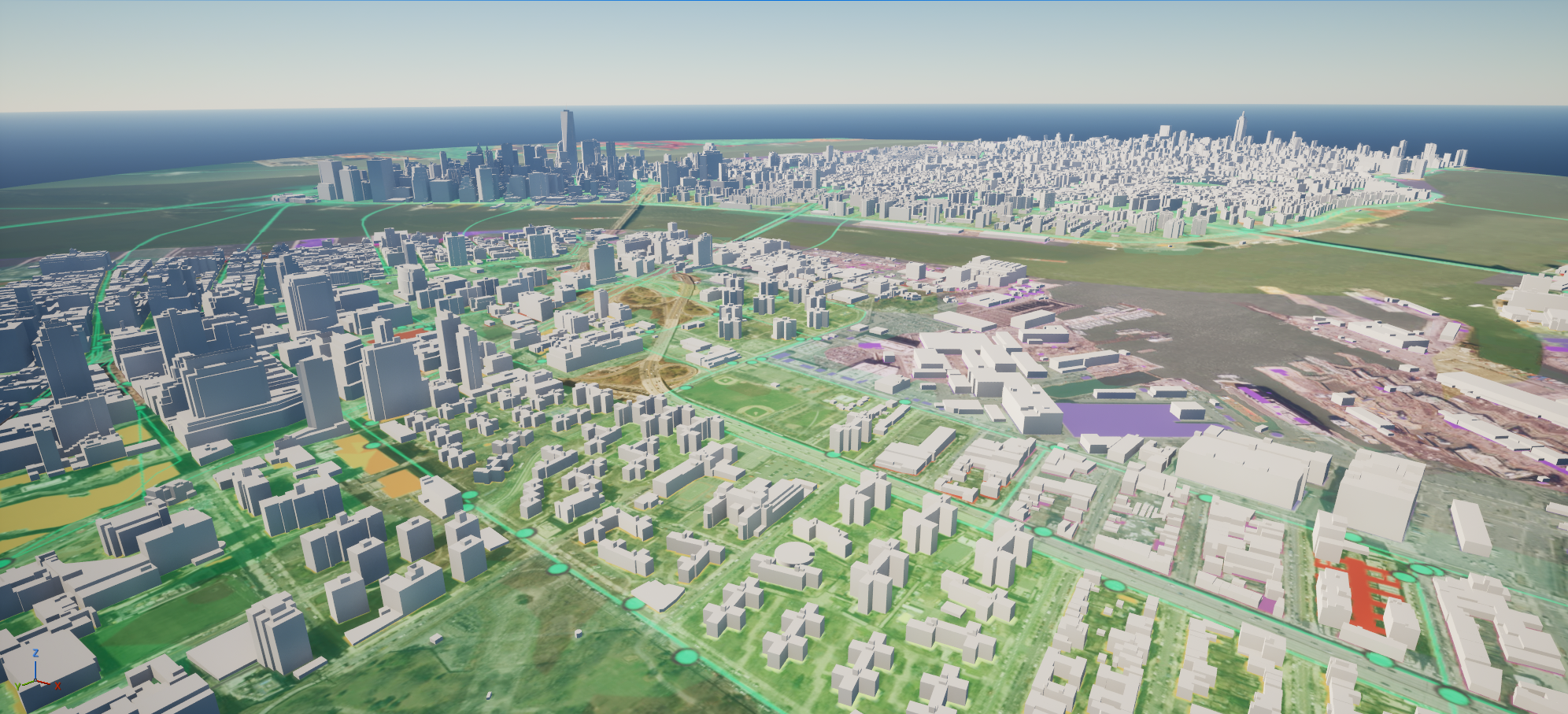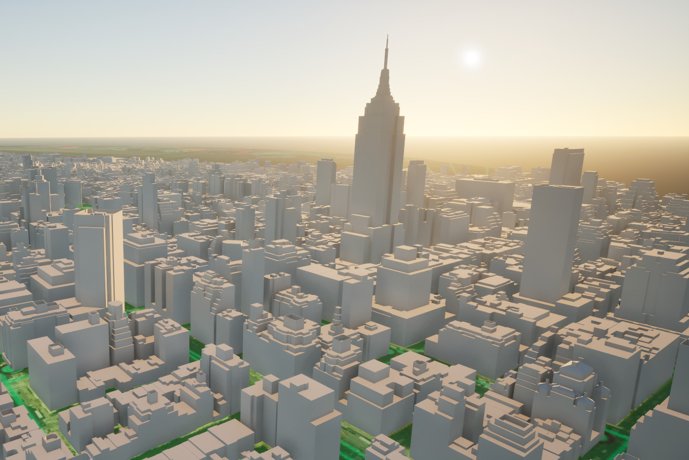 The images below depict a real-world geospatial render of Manhattan, NY, produced with the ArcGIS SDK for Unreal Engine, showcasing streamed terrain and building data used as the foundation for gameplay and AI systems.